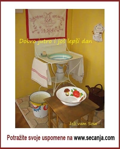 Dok nije prošao vodovod koristila je limeno korito, tu je i metalni lavor sa cvetovima…sve što je cvetno nju je privlačilo. Stoga nije teško predpostaviti kako joj je izgledalo posuđe…