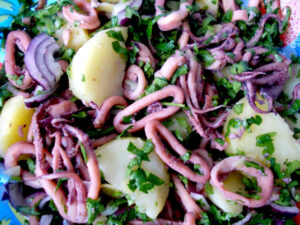 - Krompir i lignje izmešati, pa dodati iseckani crni i beli luk, ulje, limunov sok, so i biber.